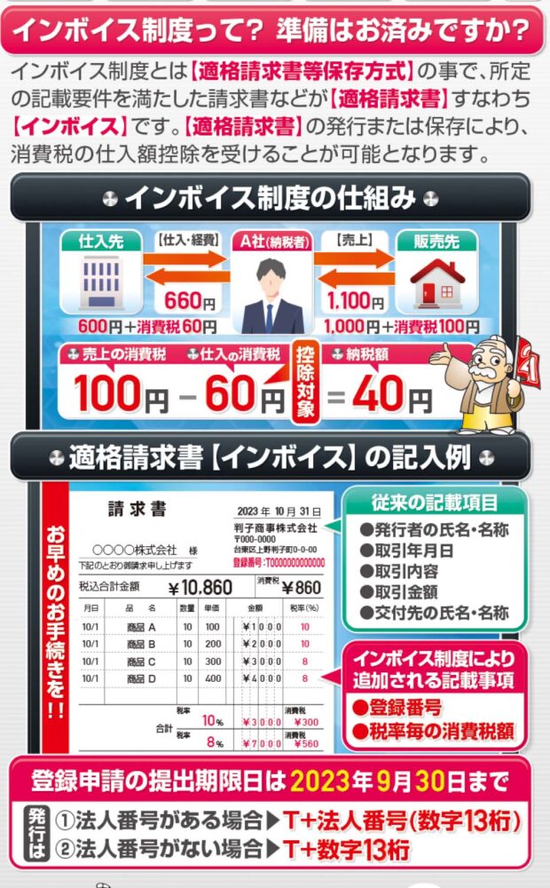 令和5年(2023年)10月1日から「インボイス制度」(適格請求書等保存方式)が実施されます。この制度は、「インボイス」(適格請求書)と呼ばれる一定の記載事項を満たした請求書等を交付し、保存する新しい制度です。