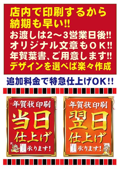 年賀状印刷の急ぎ仕上げ、対応できます!!